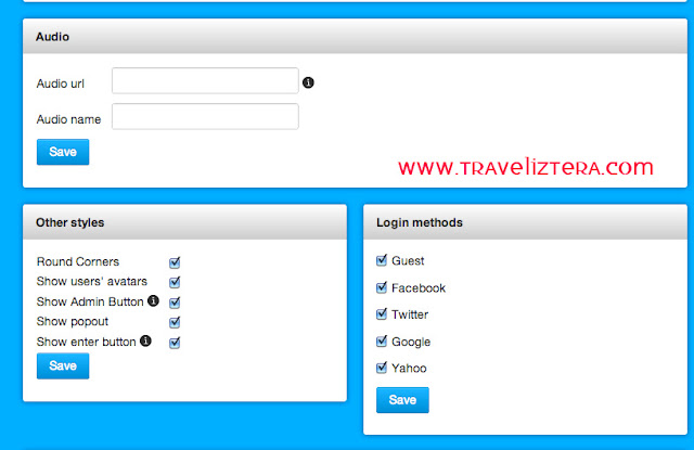 Guess what? You can also add an audio to your chatbox! Just type in your audio's url! Also, you can enable round corners, avatars, admin button, popout feature, and enter button for your Chatwing. Additionally, login methods include FACEBOOK, TWITTER, GOOGLE, YAHOO, or just temporarily login as a GUEST.